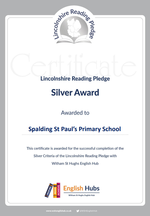 Following last year’s Bronze Award, we are proud to announce Spalding St Paul’s have now been awarded the Lincolnshire Reading Pledge Silver Award!